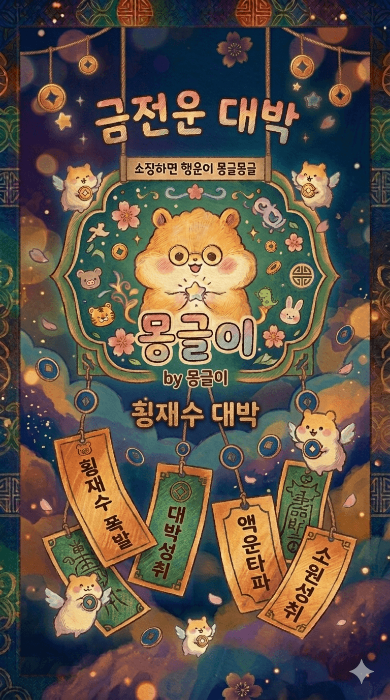 "로또 1등 당첨!", "내 집 마련 성공!", "취업 성공!" 등 여러분의 소원을 댓글로 남겨주세요. 저 몽글이가 이 부적의 기운을 담아 한 분 한 분 정성껏 기원해 드릴게요. 우리 함께 대박 나는 한 주 만들어요! 🐹💕